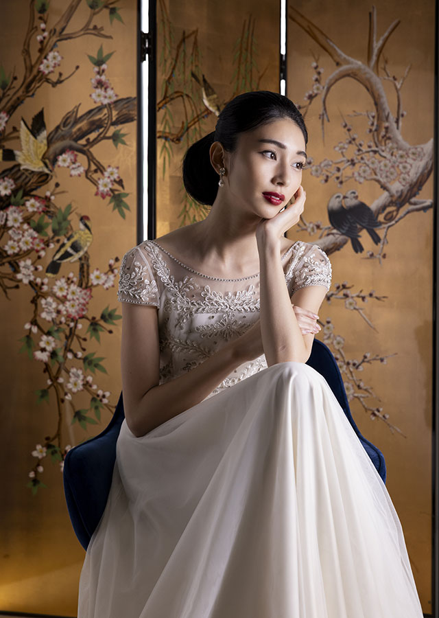 すべてシルクで仕立てられたドレスが並び、その人のために作られたかのように体にフィットし、女性らしいしなやかなラインが美しさを引き立てます。
