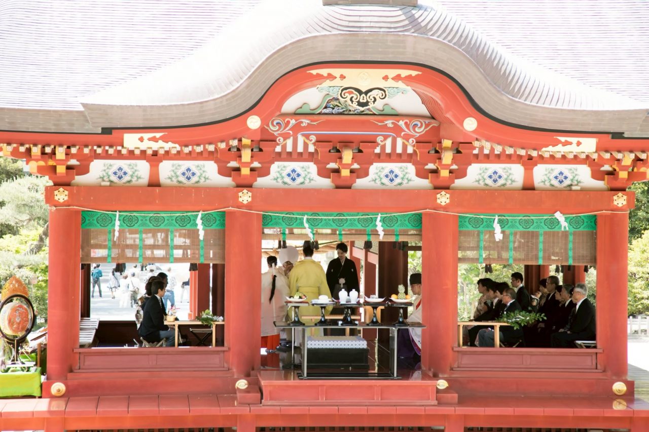 神殿内への参列は親族のみ(新郎新婦様を含む38名まで)とされていますが、舞殿での挙式であれば、神前式を舞殿の外から見届けることができます。