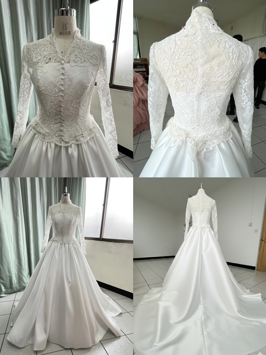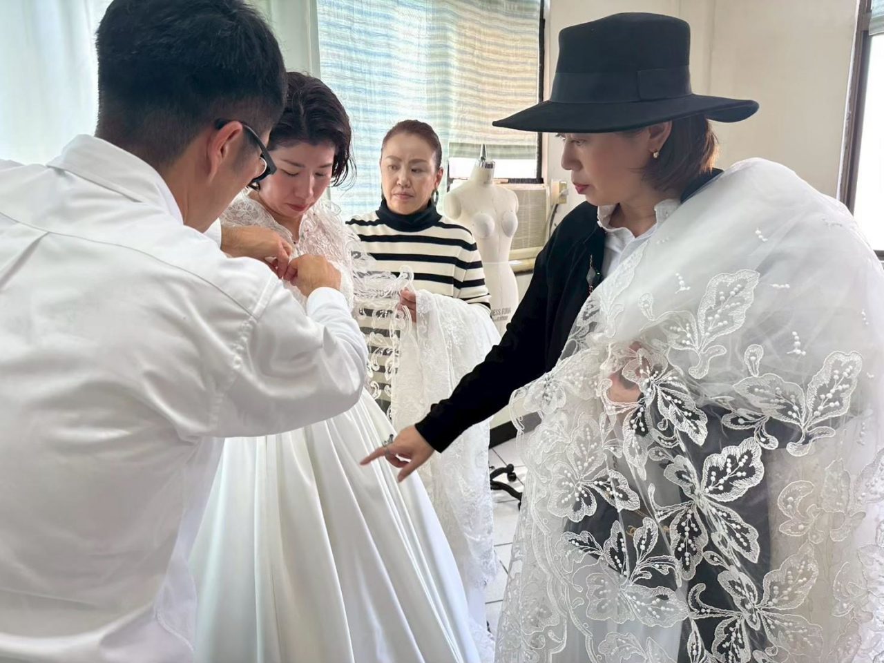 ↓こちらの写真は今回訪れた台湾アトリエで、サンプルとして製作していただいたドレスを試着し、イメージのすり合わせやデザインの修正をしている場面です。