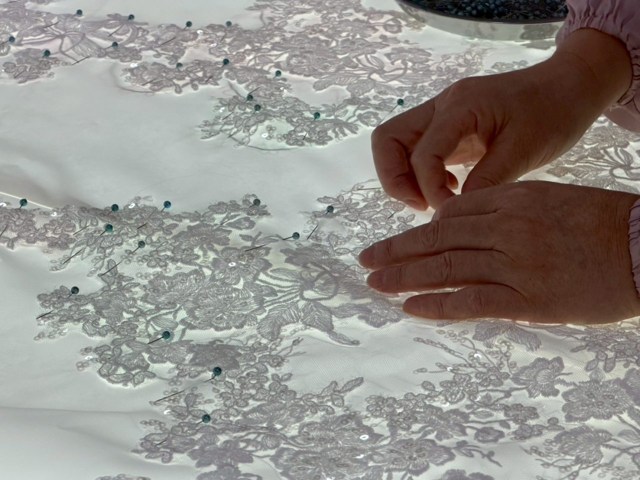 厦門アトリエでは、三河屋本店オリジナルドレス2点のデザイン確認と、実際の縫製現場を見学させていただきました。