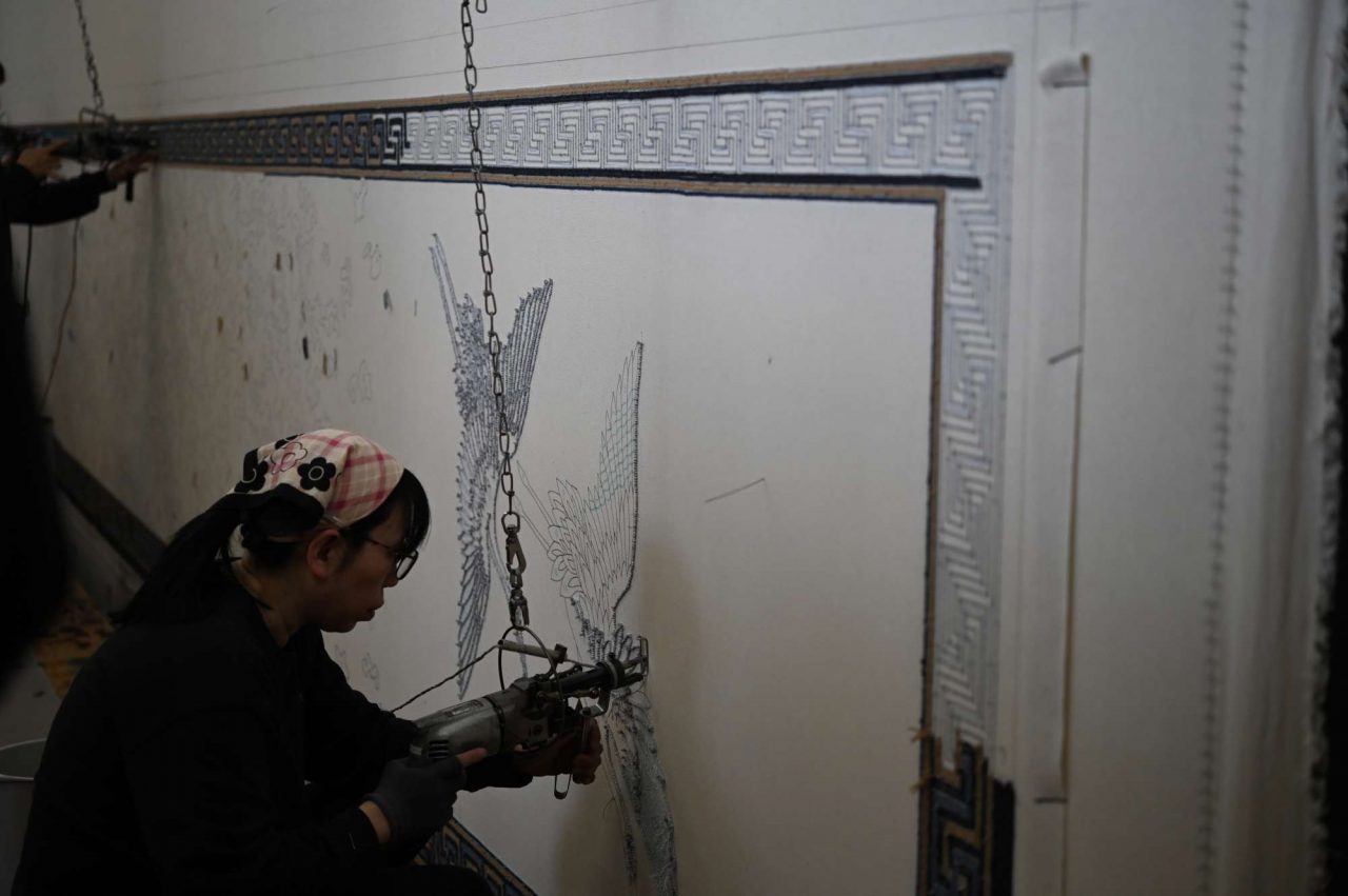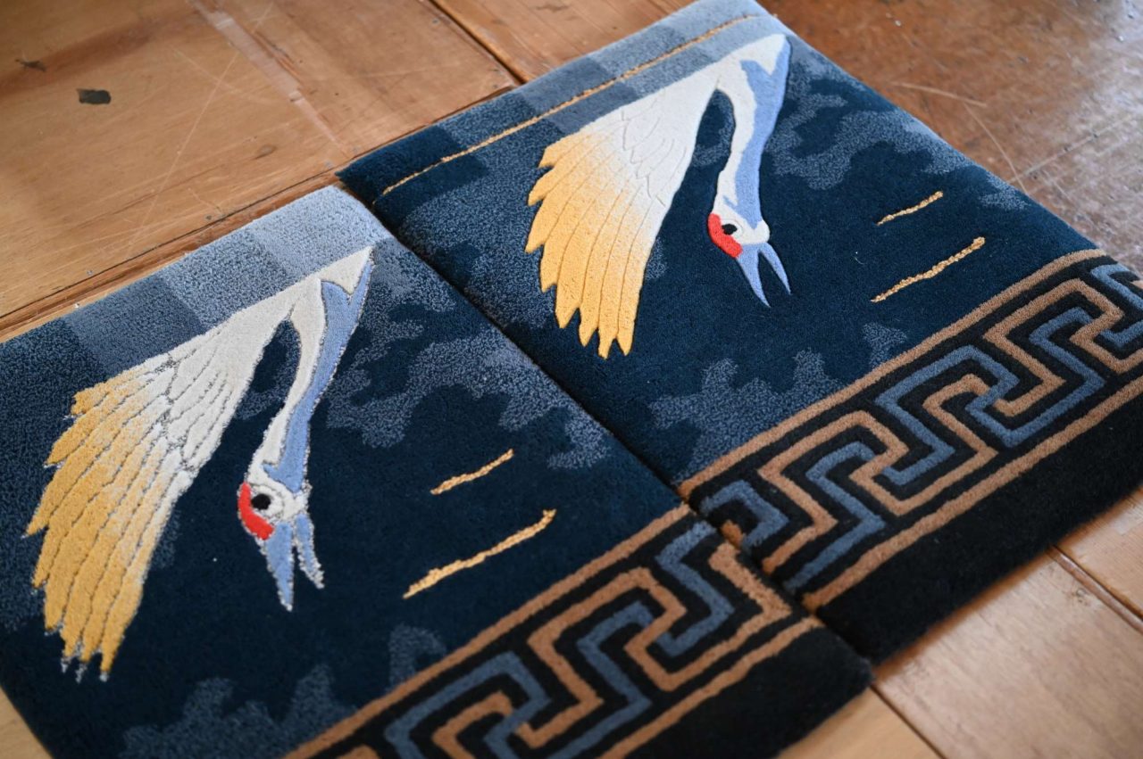 この絨毯には、適材適所で異なる糸が使われています。鶴の部分には細い糸を使用して繊細な表情を出し、よく踏まれる地の部分には頑丈な糸を使用することで、美しさ(意匠性)と耐久性(機能性)を両立させました。まずは「捨て折り」と呼ばれる手法で鶴の輪郭などを縁取り、そのあとに中のグラデーションや地の部分を打ち込んでいきます。こうすることで、高解像度で美しい鶴の柄を表現するそうです。
