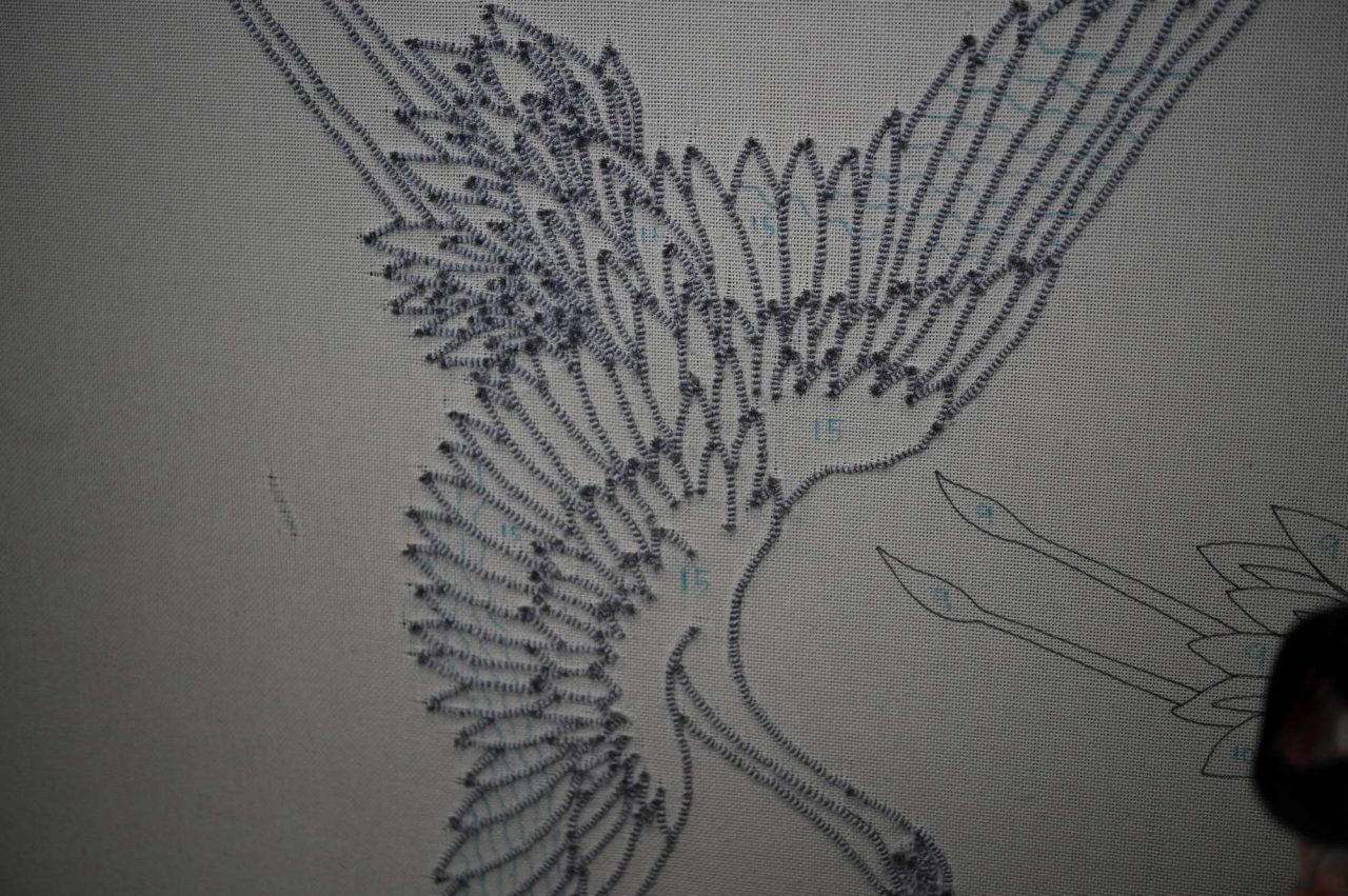 フックガンを用いて、糸を射出して織り込んでいる様子。