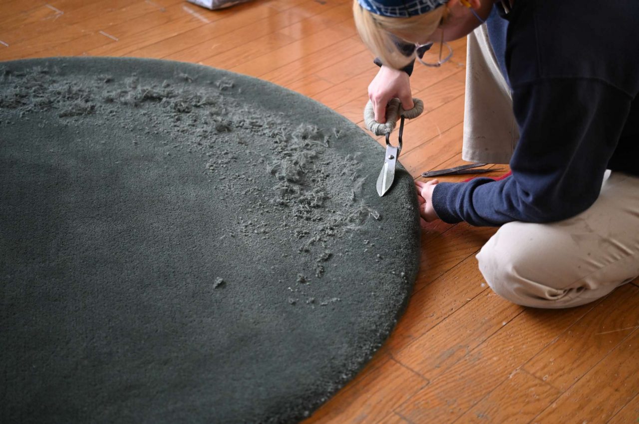 「フックガン」という専用の工具を使い、キャンバスに糸を射出して刺繍のように織り込んでいく「ハンドタフテッド」という技法を用います。機械作業ではなく、人の手による手仕事です。職人さんの力の入れ具合ひとつで絨毯の密度や柄の形が変わってしまうため、布を切らないように均一に打ち込んでいくのは、熟練の技とのことです。