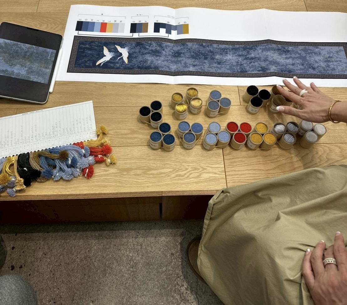 その後「糸選び」の打ち合わせを実施しました。シルクやウールの糸を実際に見比べながら、鶴の純白、頭頂部の朱色、外側のボーダー模様、そして重厚感を際立たせる銀糸など、全体のバランスを見ながら糸を組み合わせていきました。