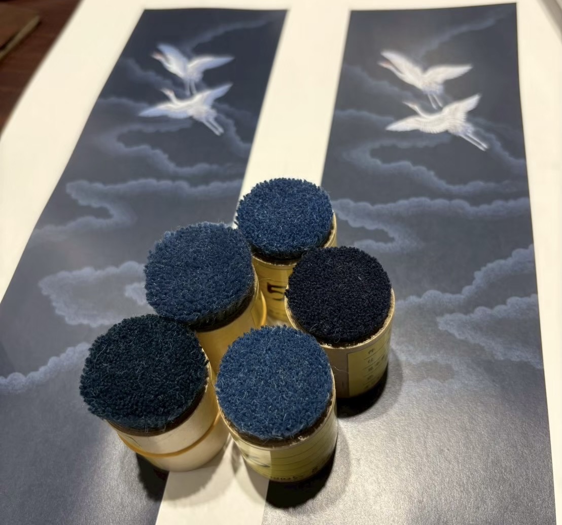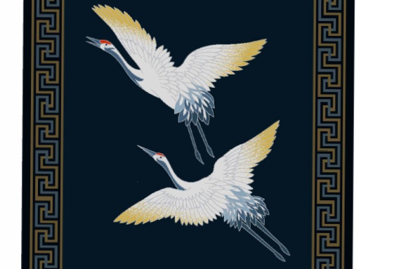 ベースカラーには空間を引き締め、格式高さを演出する「紺」を選択しました。そしてメインデザインには、ハレの日にふさわしい「つがいの鶴」を配しています。
