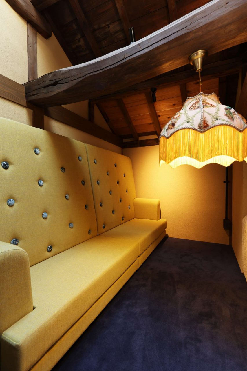 黄色のシェードと黄色のソファを組み合わせた半個室空間