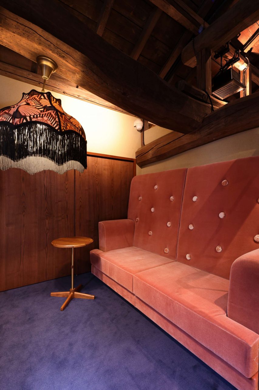 壁際に配置されているのは、スイス・チューリッヒのホテルに着想を得てデザインされた、少し座面の高いソファです。