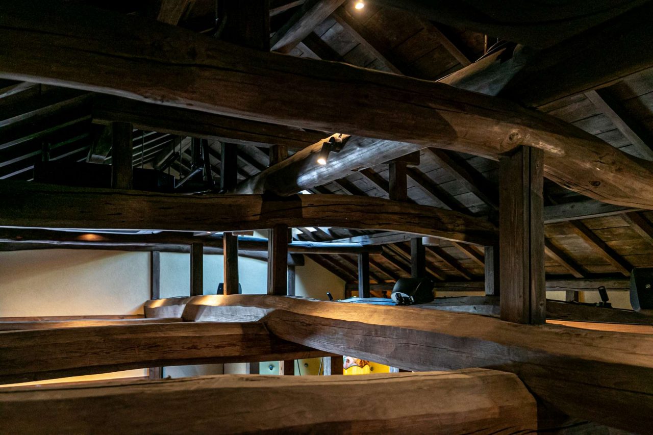 建てられた当時のまま天井板を張らず、屋根裏の「小屋組」がそのまま見えるダイナミックな構造を残しました。既存の歴史ある木造建築の美しさを最大限に活かしつつ、梁や壁を強化する耐震補強もしっかりと施しています。安心してお過ごしいただける空間の中で、建物の歴史をそのまま肌で感じていただけます。