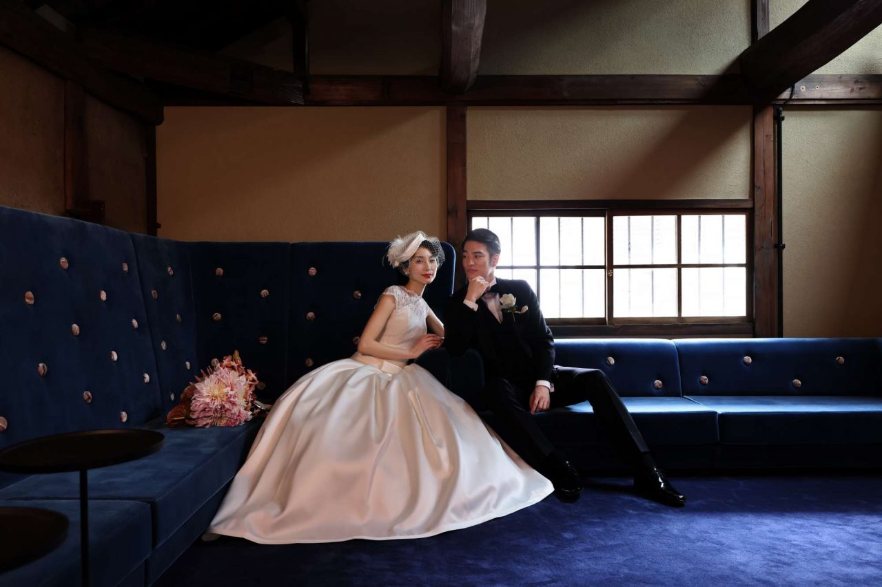 ソファのボタンにはロンドンの輸入生地をアクセントとして使用し、細部に遊び心を散りばめました。ゲストの皆様が思わずお写真を撮りたくなるような、そして前撮りの素敵なフォトスポットとしても映える空間設計をイメージしました。
